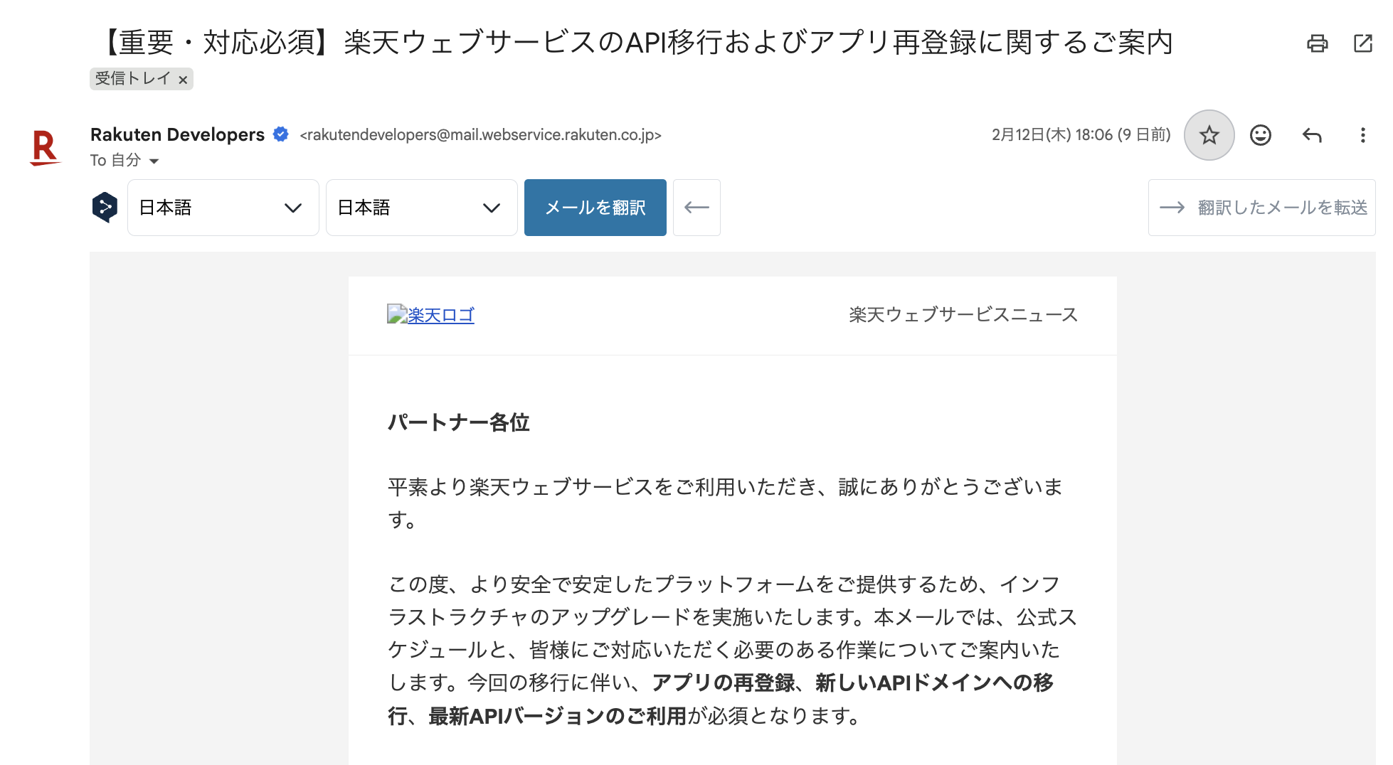 2026年5月13日をもって、楽天WebサービスAPIが更新される通知が配信されました。