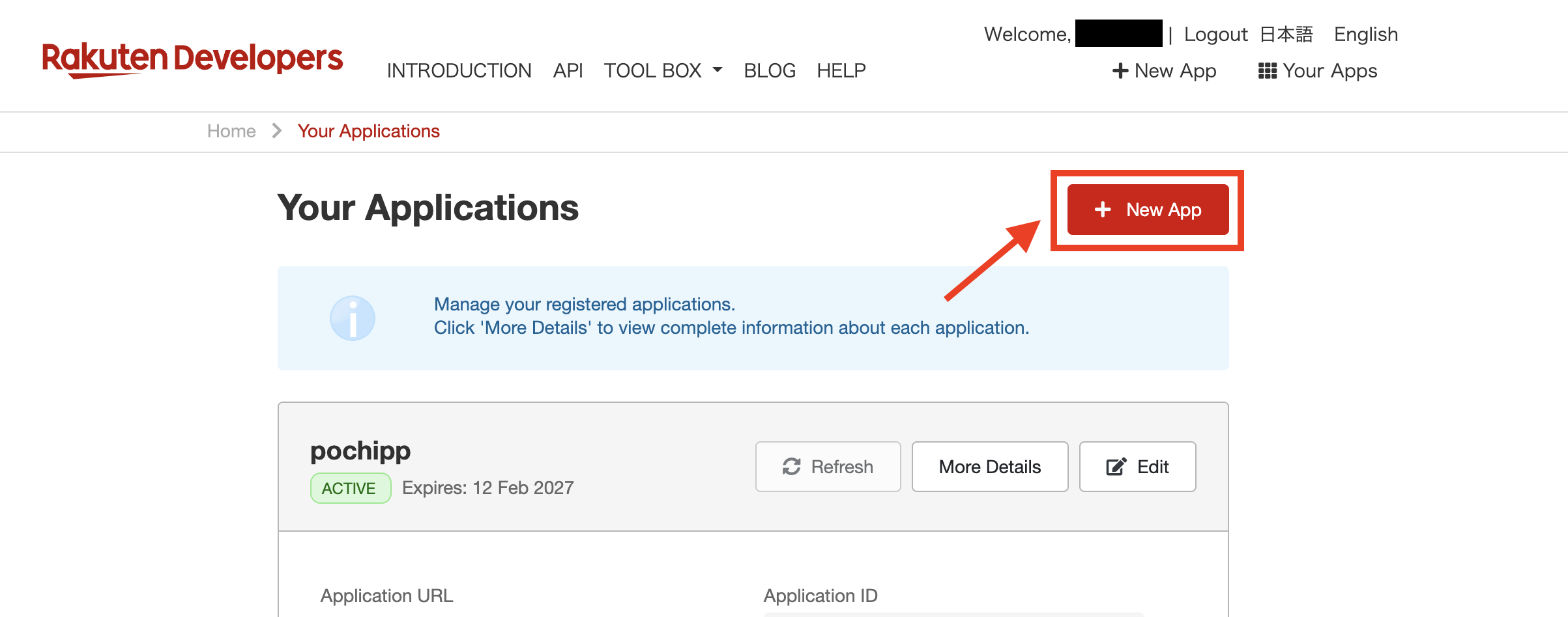 Rakuten Developers にアクセスし、メニューの「Your Apps」からアプリ一覧を表示します。