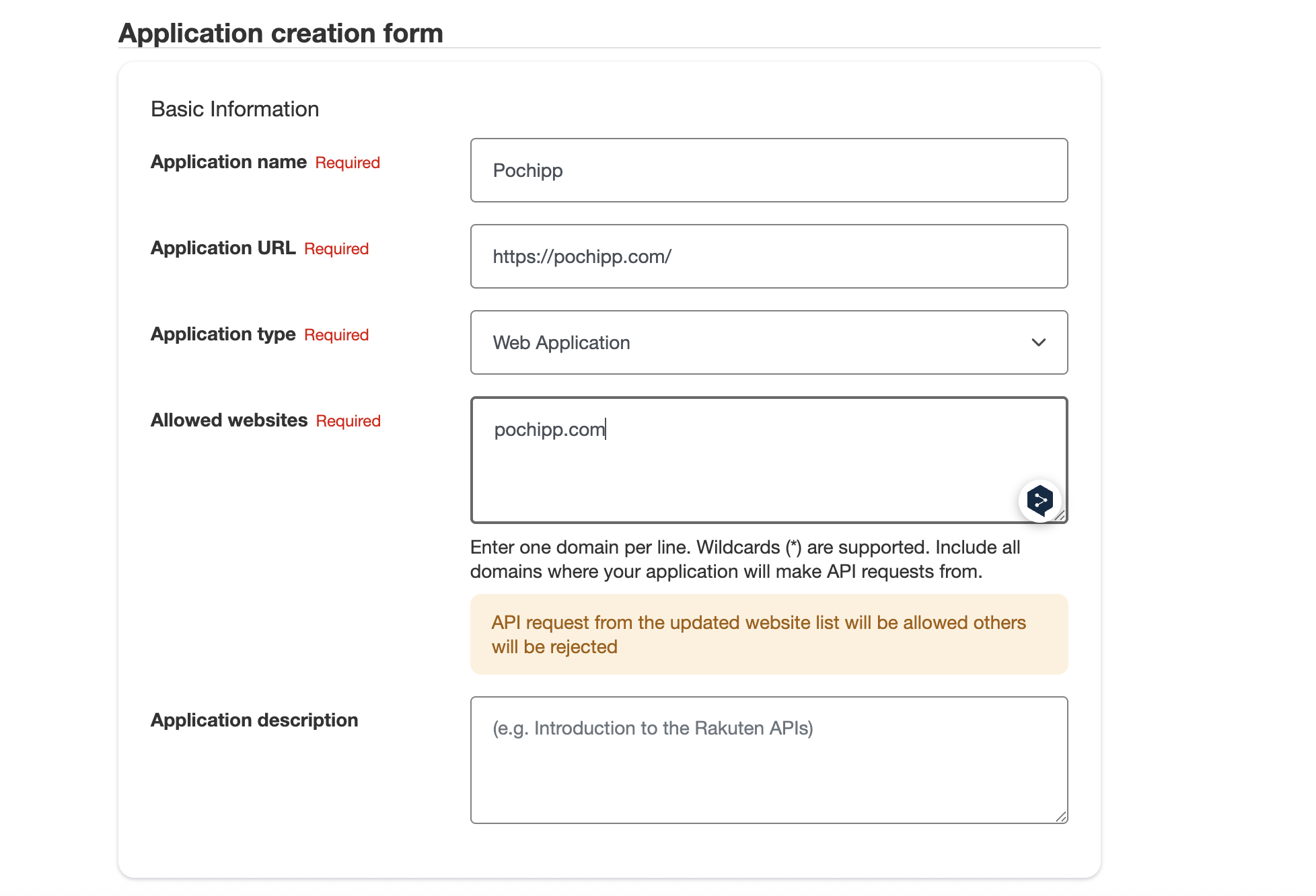 - Application websites: Application URLから「https://」を削除してください。末尾のスラッシュも削除してください。